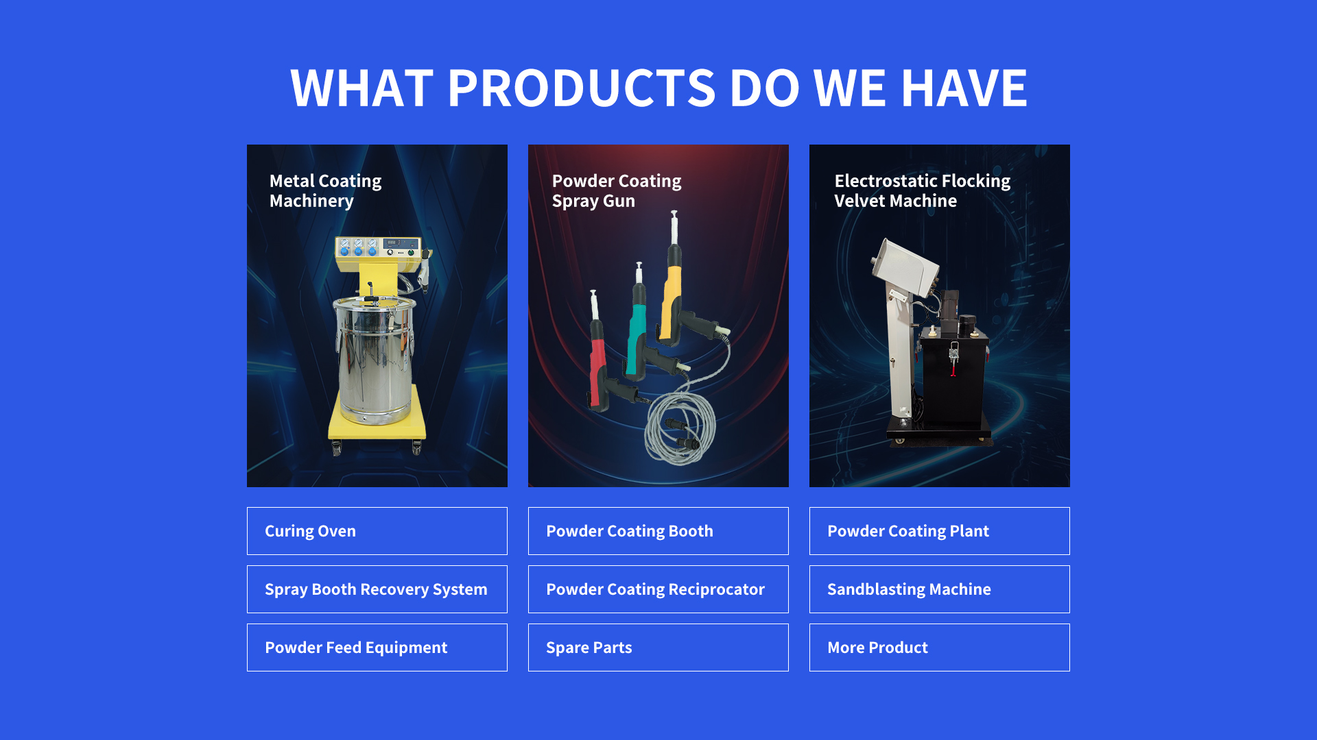 A Powder Coating Equipment Factory produces systems for applying and curing powder coatings. Key components include electrostatic spray guns, powder booths, curing ovens, conveyor systems, and recovery units.